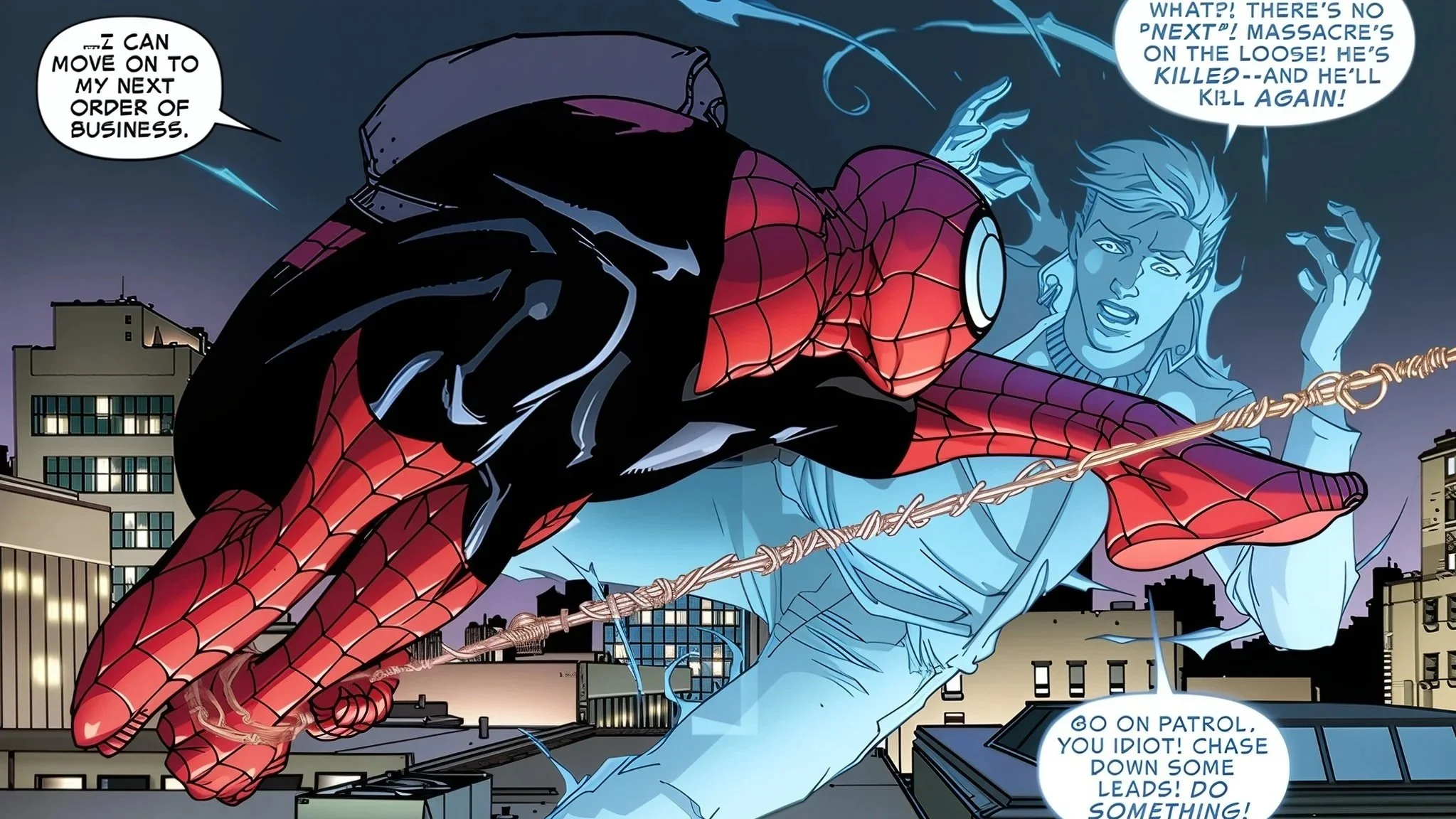 Spider-Man's new brutality divides the city. When Otto tracks down the serial killer Massacre, Peter's ghost appears throughout the hunt, desperately trying to stop what's coming. Otto doesn't hesitate—he executes Massacre in cold blood. The media explodes: justice or murder? Heroes debate. The public splits. Peter's ghost remains at the crime scene long after Otto leaves, powerless and broken.